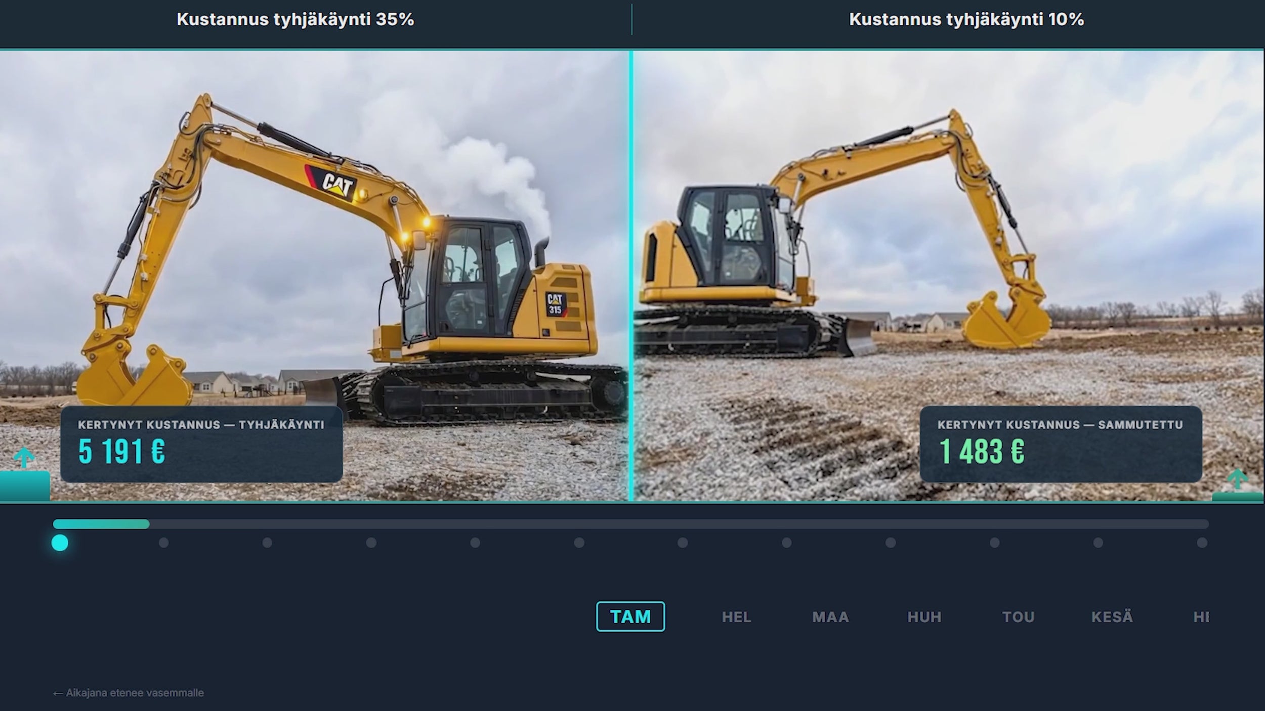 Videon esimerkissä on 30 tonninen kaivinkone jossa toisessa skenaariossa tyhjäkäynti on 35% ja toisessa 10%. Käyttötunteja on 2000h vuoden aikana.